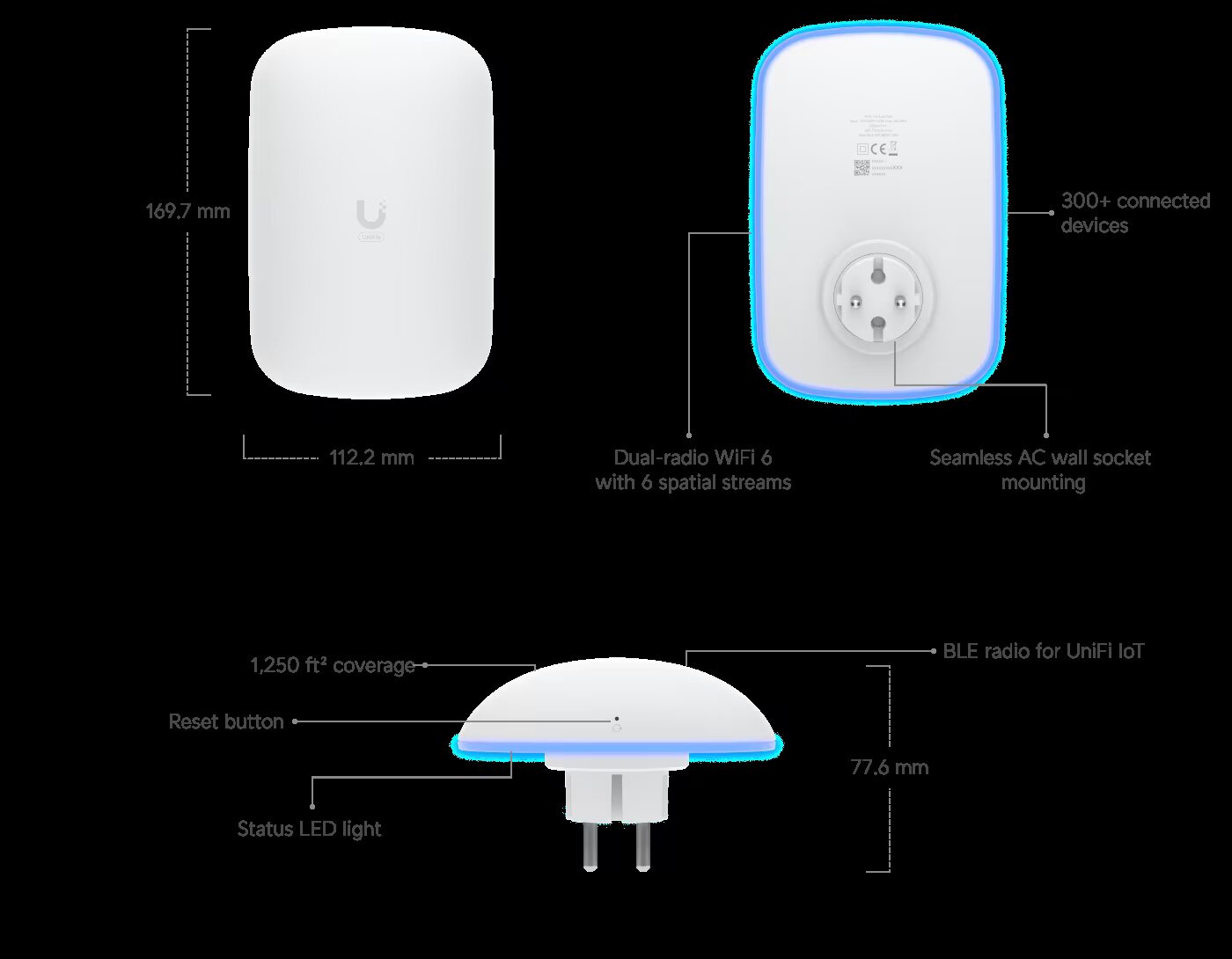 UniFi6 Extender (U6 Extender) je přenosný WiFi 6 přístupový bod, který může snadno a okamžitě rozšířit bezdrátové pokrytí vašeho domova nebo kanceláře. Se svým dvoupásmovým designem a souhrnnou propustností 5,3+Gb/s poskytuje U6 Extender silnou a spolehlivou konektivitu potřebnou pro podporu i těch nejhustších sítí. U6 Extender lze do vaší sítě adaptovat během několika minut a centrálně spravovat buď pomocí webové aplikace UniFi Network nebo mobilní aplikace.