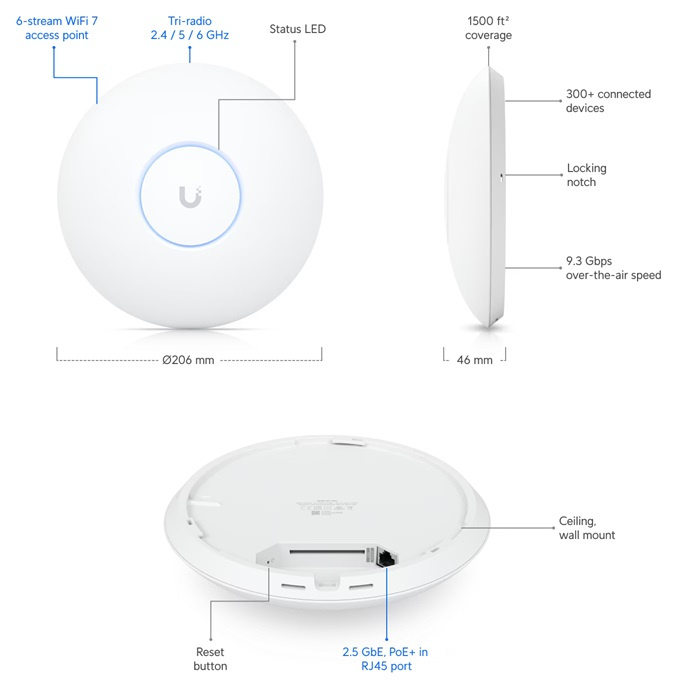 Technické parametry Bezdrátové frekvence: 2,4 + 5 + 6GHz (triple band) WiFi standardy: 802.11a/b/g/n/ac/ax/be Propustnost (2,4; 5; 6GHz): 688Mb/s; 4324Mb/s; 5764Mb/s Vysílací výkon (2,4; 5; 6GHz): 22dBm; 26dBm; 23dBm Zisk antény (2,4; 5; 6GHz): 4dBi; 5dBi; 6dBi Šifrování: WPA-PSK, WPA-Enterprise (WPA/WPA2/WPA3/PPSK) Síťová rozhraní: 1x port 2,5GbE PoE+ RJ45 Rozhraní pro správu: Ethernet Metoda napájení: PoE+ Napájení přes PoE: 44-57V DC Zdroj napájení: UniFi PoE switch Max. spotřeba energie: 22W Provozní teplota: -30 až 60 °C Použití: vnitřní Rozměry: 150x103x36mm Hmotnost: 580g