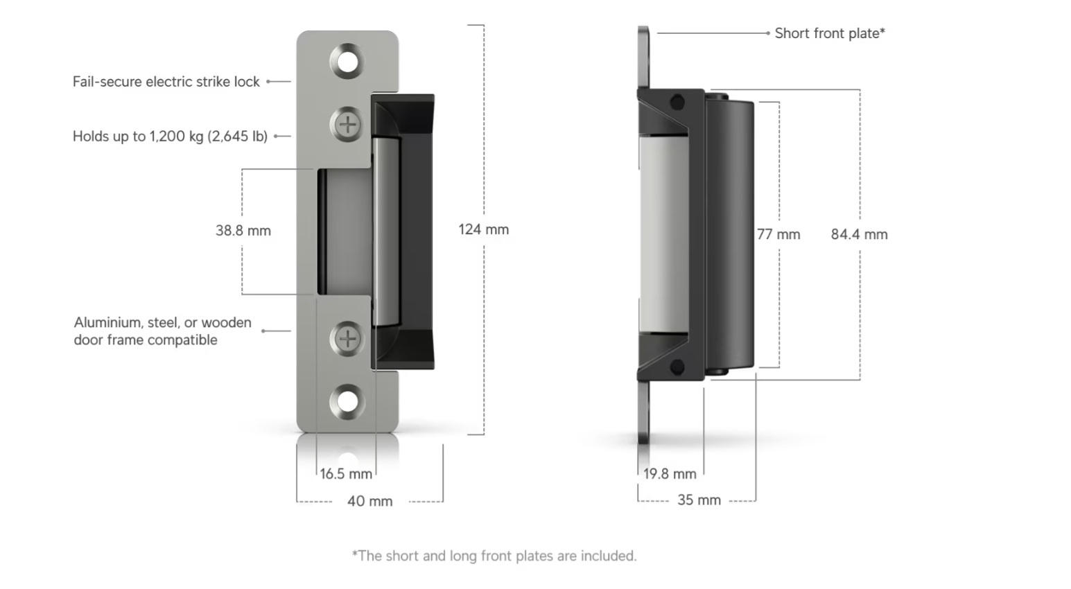 Mechanické *Rozměry: Tělo zámku: 80 × 40 × 35 mm; krátká čelní deska: 124 × 32 × 3 mm; dlouhá čelní deska: 202 × 36 × 3 mm *Hmotnost: Tělo zámku: 185 g; krátká čelní deska: 50 g; dlouhá čelní deska: 130 g *Materiál krytu: Tělo zámku: slitina zinku; čelní deska a západky: nerezová ocel