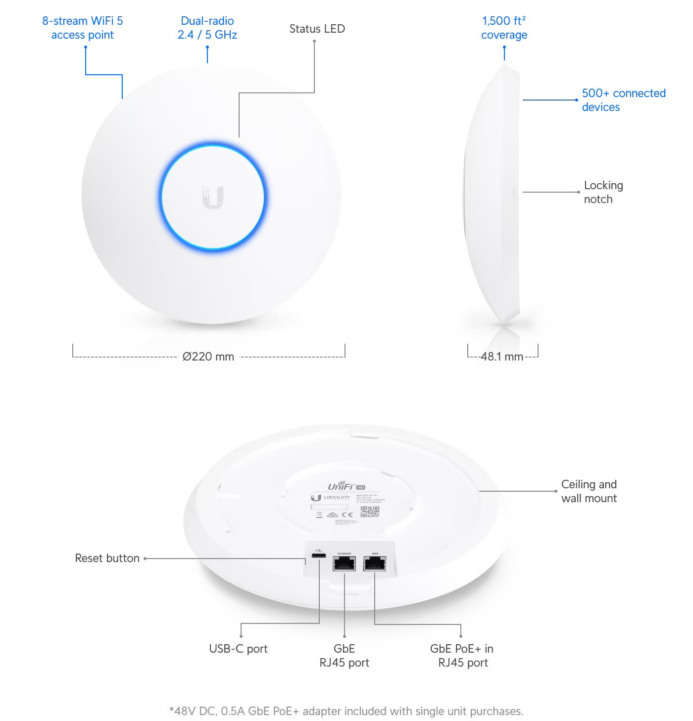 Ubiquiti UniFi AC HD je 802.11ac UAP zařízení. Jedná se o 4x4 MU-MIMO 2,4GHz i 5GHz Acess Point s rychlostí přenosu až 1733+800Mb/s a podporou norem 802.11a/b/g/n/ac/ac-wave2. Toto UAP je určeno například pro kanceláře, hotely, sklady a díky vysokému výkonu se hodí do míst, kde se předpokládá velký počet připojených zařízení. Anténní systém obsahuje dvě vestavěné dualband 3dBi antény (2,4GHz) a dvě vestavěné dualband 4 dBi antény (5GHz) a s dosahem do vzdálenosti až 122 metrů. Plně podporuje také roaming pro předávání asociovaných klientů mezi jednotlivými AP. Co se konektorů a napájení týče UAP-AC-HD obsahuje 1xUSB 3C port a 2x Gigabit LAN, z nichž 1 podporuje 48V (44 až 57V) napájení přes PoE (pasivní iaktivní 802.3at).