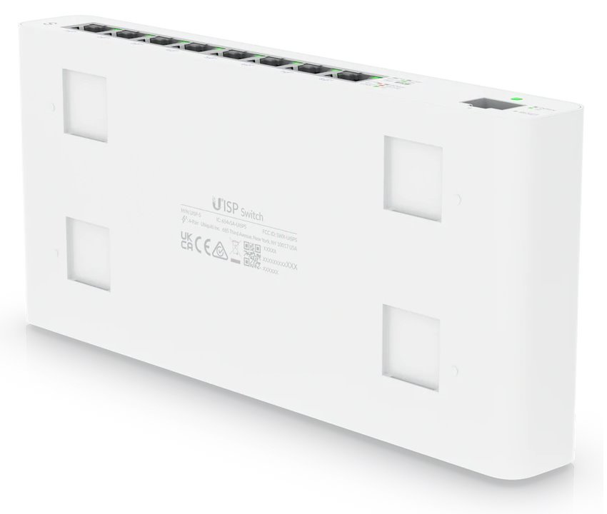 Ubiquiti UISP Switch UISP Switch je osazen osmi GbE PoE RJ-45 a jedním GbE SFP slotem pro uplink. Jedná se o bezventilátorový L2 přepínač s kapacitou 18Gbps a rychlostí směrování 13,392Mpps. Celková napájecí PoE kapacita switche je 110W. Switch lze navíc upevnit ke zdi, díky přiloženému držáku.