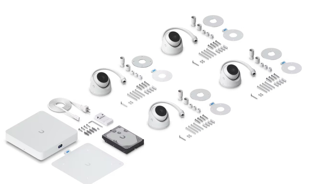 * All-in-one sada obsahující UniFi Protect NVR Instant, čtyři kamery G5 Turret Ultra a 1TB HDD pro okamžitou instalaci.