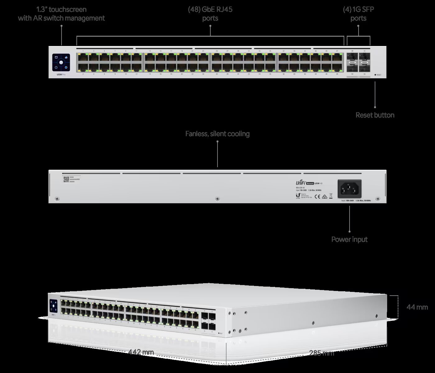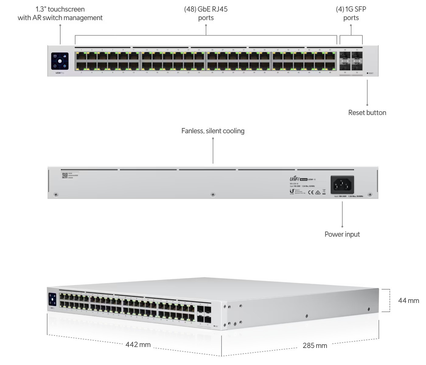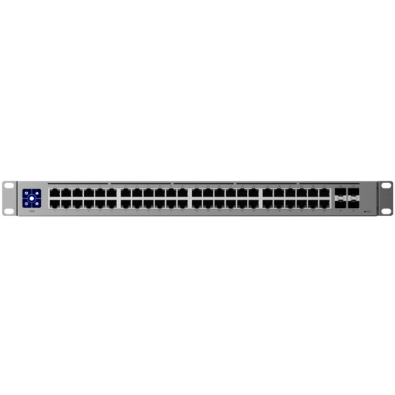 Vlastnosti a funkce * 48x 1Gbps ethernet * 4x 1Gbps SFP port * L2 funkce * Fanless * 1,3" dotykový displej, podpora UniFi Network AR