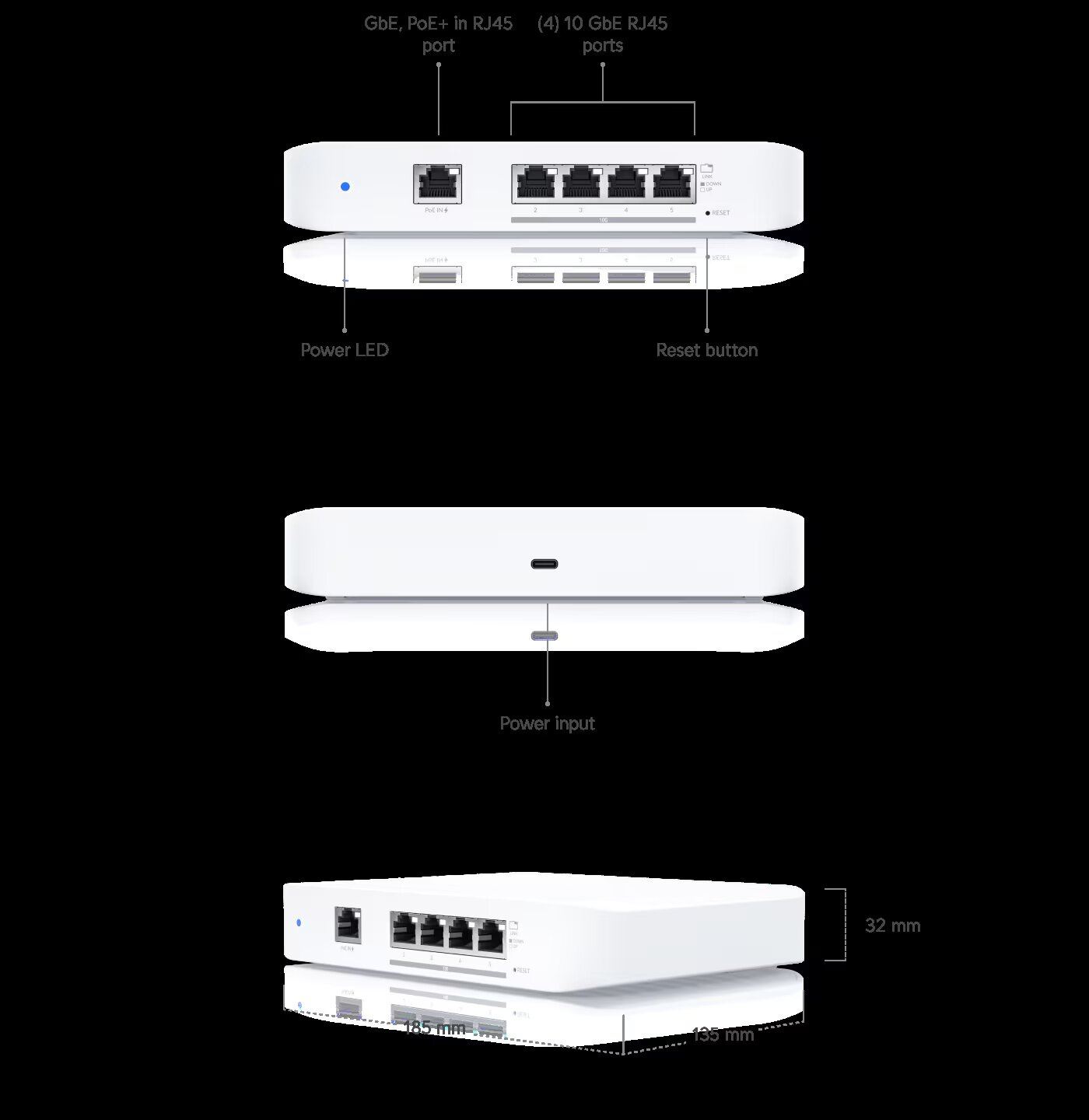 UniFi Switch Flex XG od Ubiquiti Networks je plně managovatelný L2 UniFi Switch s (4) 10Gb ethernetovými porty a (1) Gigabit LAN podporující PoE IN (802.3af). Velmi kompaktní a bezventilátorové desktop provedení doplňují informační LED diody indikující stav linky. Switch je možné napájet přes první port pomocí PoE IN nebo přes USB-C na zadní straně.