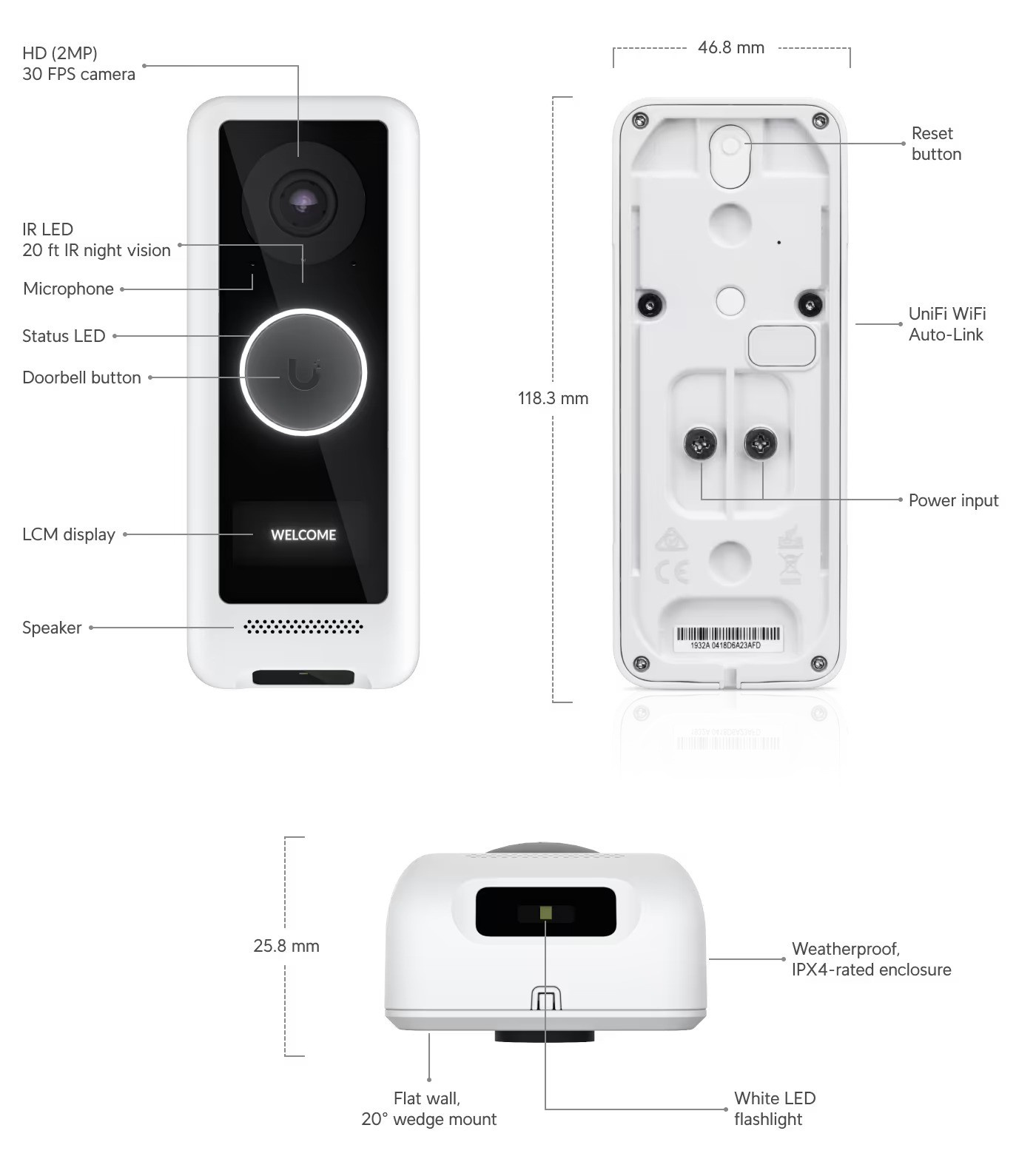 Důležité vlastnosti *rozlišení kamery 1600x1200 (2MP) HD s nočním režimem *vestavěný přísvit *obousměrné audio s potlačením ozvěny *vestavěný displej *Dual-band 802.11ac Wi-Fi *PIR senzor pro detekci pohybu *odolnost proti vodě (IPX4) *integrace do UniFi Protect