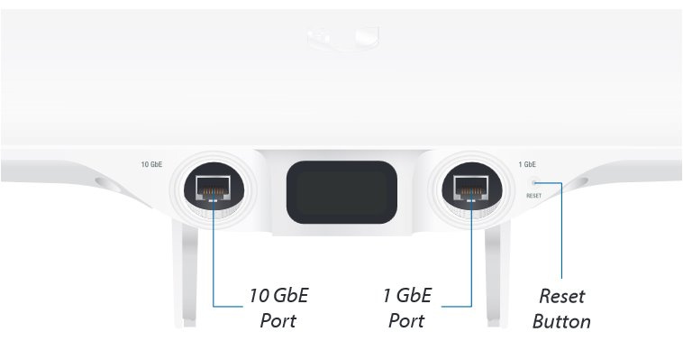 Přenos dat po ethernetu zajistí dvojice portů (1x 10/100/1000Mbps, 1x 1/10Gbps IMC). Napájení jednotky je možné aktivním POE 802.3bt nebo přiloženým POE adaptérem 50V/1,2A s gigabitovým portem.