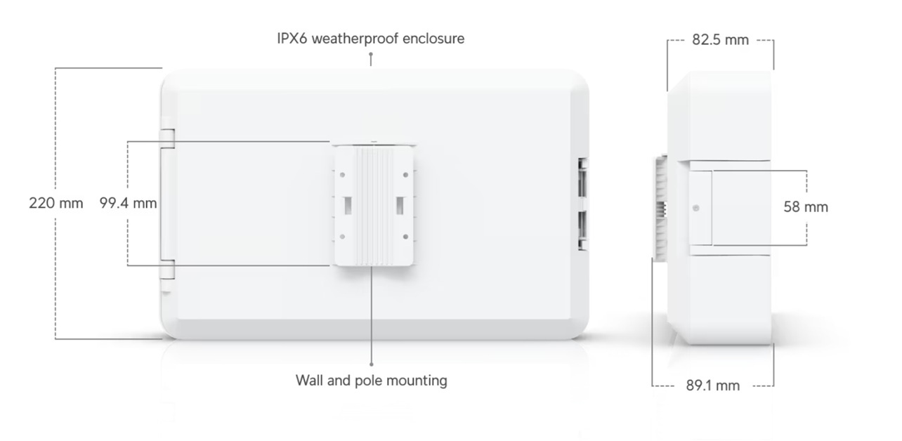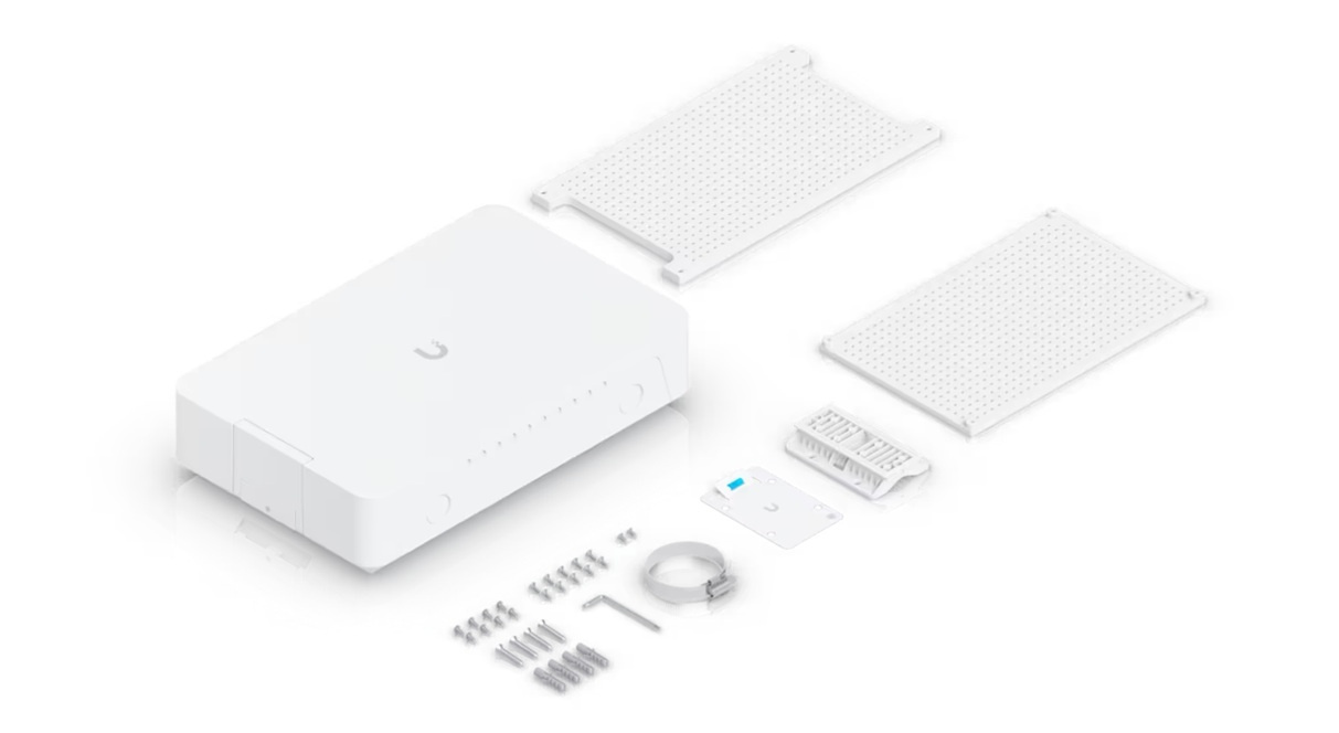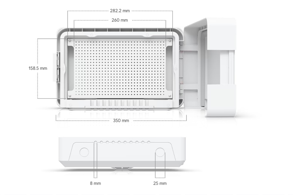 Ubiqutii UACC-Flex-Utility-Pro, Flex Utility Pro Odolná venkovní instalační skříň navržená pro umístění síťových zařízení Ubiquiti. Poskytuje vysokou mechanickou odolnost, krytí IPX6 a ochranu proti povětrnostním vlivům. Rozměry a hmotnost * Rozměry (Š × V × H): 350 × 220 × 89 mm * Hmotnost: 1.6 kg Materiál a konstrukce * Materiál krytu: Polykarbonát * Stupeň krytí: IPX6 (odolné silnému proudu vody, vhodné pro venkovní použití) Odkaz na web výrobce: https://techspecs.ui.com/unifi/switching/uacc-flex-utility-pro