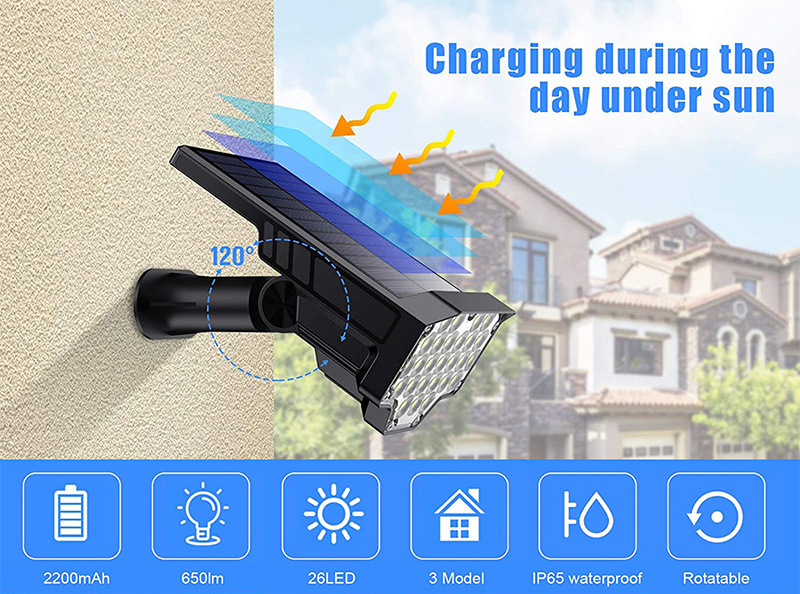Popis Vonkajšie solárne LED svetlo VIKING D26/650lm/2200mAh/3 režimy/IP65/inštalácia-zem i stenu