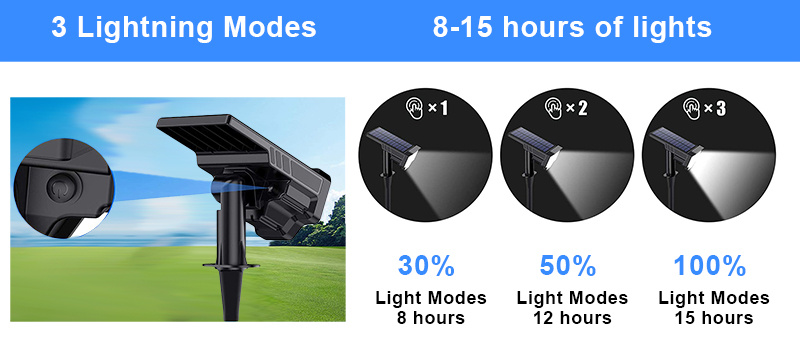 Baterie v solárním světle poskytuje dostatečný výkon pro celonoční osvětlení. Doba svitu záleží na intenzitě světla. Podle vybraného světelného režimu vám LED světlo vydrží svítit 8-15 hodin.