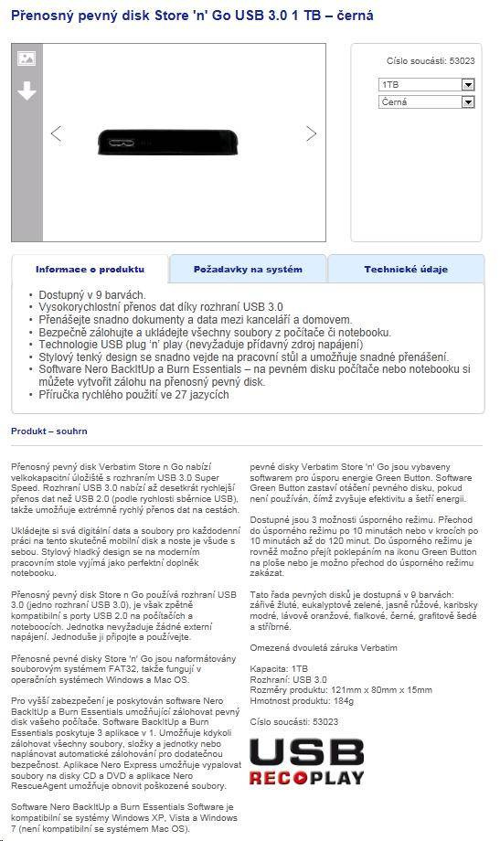 Prenosný pevný disk Verbatim Store 'n' Go 1 TB USB 3.0 Špeciálne vlastnosti: Dostupné farby: čierna, strieborná, eukalyptovo zelená, horúco ružová, karibská modrá, fialová, sopečná oranžová, opálená žltá, grafitovo sivá Ultra rýchle USB 3.0 2.5@ (6.35 cm) externý pevný disk, kompatibilný smerom nadol s USB 2.0 USB 3.0 teoretická maximálna rýchlosť prenosu dát: 5 Gb/s -> až 10x rýchlejší ako USB 2.0 FAT-32 predformátovaný, okamžite pripravený na použitie v PC aj Mac Vrátane rozsiahleho softvérového balíka: Zálohovací softvér na jednoduché zálohovanie súborov z počítača na externý pevný disk, softvér na úsporu energie Green Button, kontroluje spotrebu energie disku, formátovací softvér na jednoduché (pre)formátovanie externého pevného disku 2 roky záruka výrobcu Hmotnosť produktu: 184 gramov Rozmery produktu: 80 mm x 121 mm x 15 mm (š x d x v) Systémové požiadavky: PC alebo Mac s USB 3.0 / USB 2.0 / USB 1.1 Port Windows XP / Vista / Windows 7 Mac OS X 10.4 alebo vyššia Jadro Linuxu 2.6 alebo vyššia..