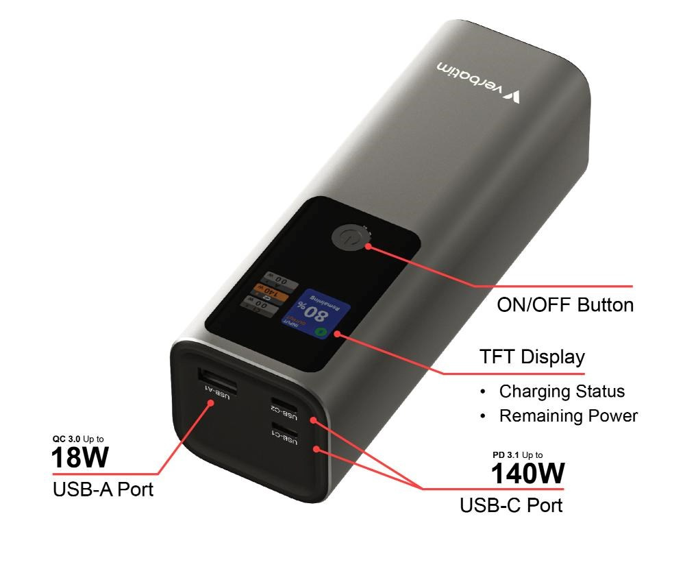 VERBATIM Powerbanka Charge 'n' Go, 27000 mAh, 2x USB-C 140W, 1x USB-A 18W, Šedá