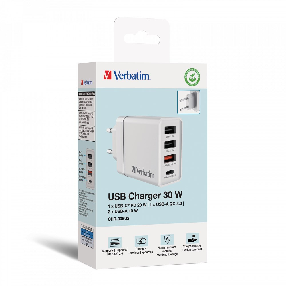 VERBATIM Univerzální adaptér nabíječka CHR-30EU2, 30W, 1x USB-C, 3x USB bílá