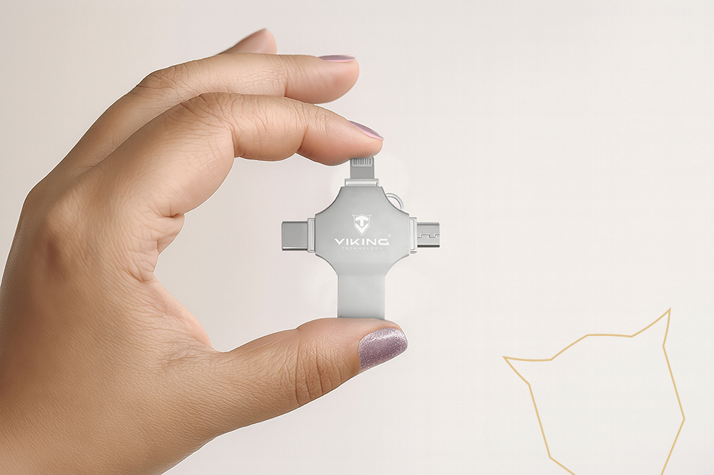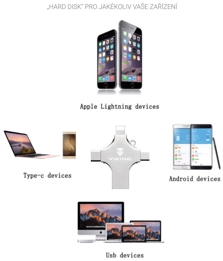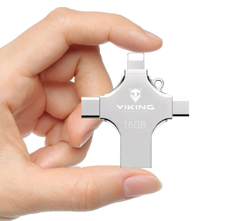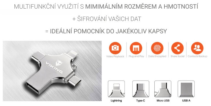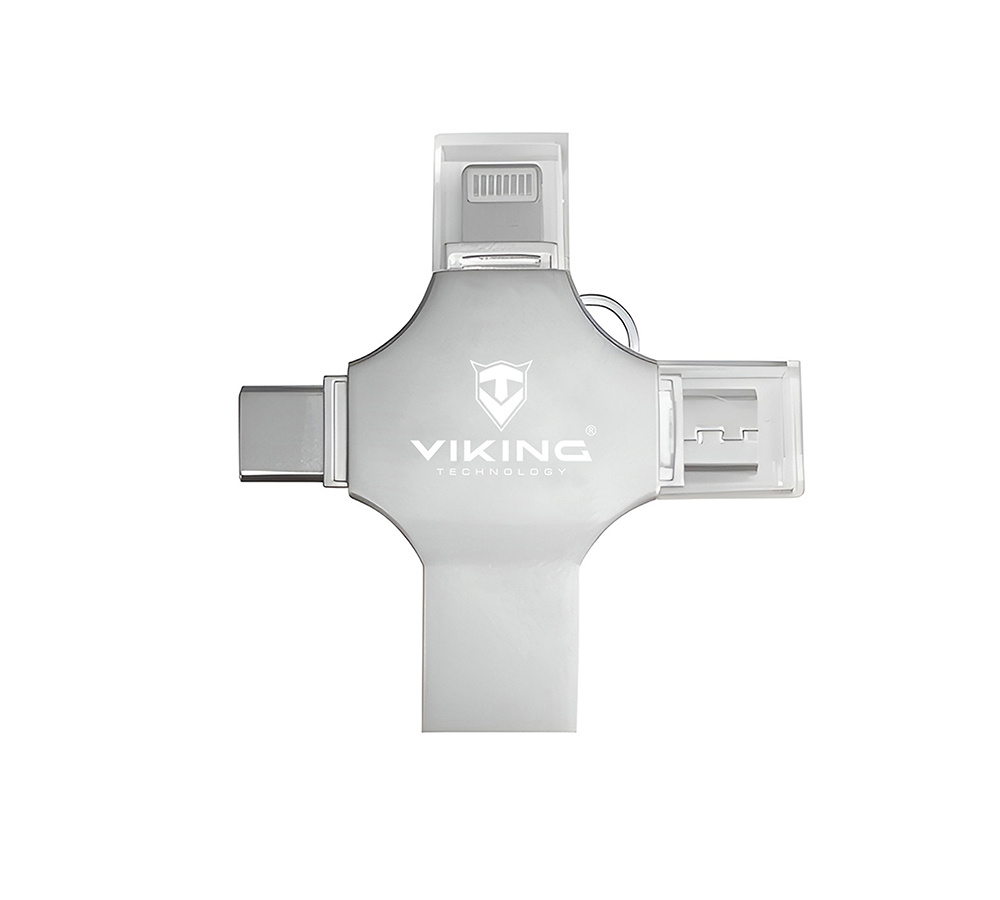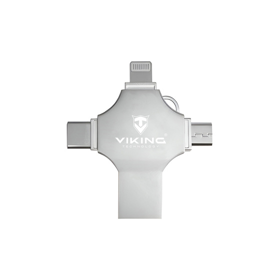 Viking USB flash disk 16GB 4v1 • 4 konektory: USB-A, USB-C, Micro USB, Lightning • Varianta 16 GB • podpora FAT32 a exFAT • vhodný pro iOS, Android, PC i Mac • Kompaktní a lehké provedení • hmotnost 13?g