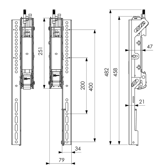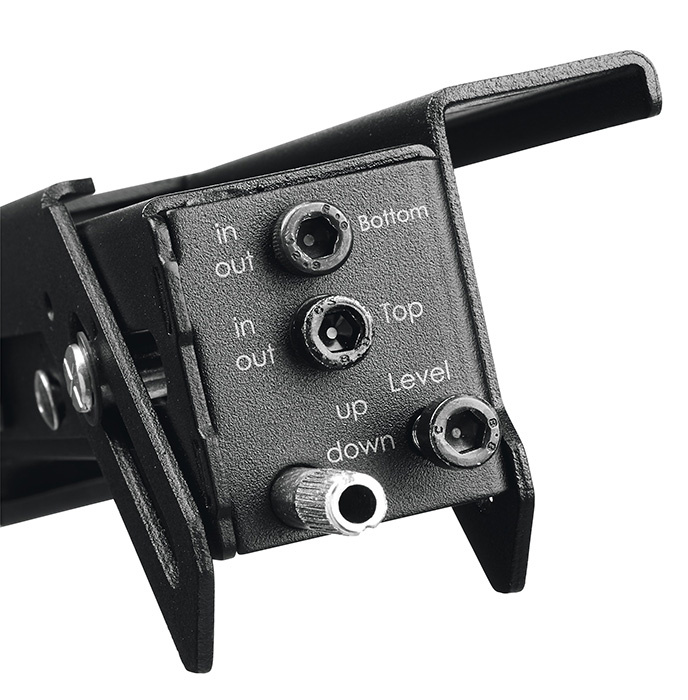 snadné nastavení v horní části ramene nastavení ve 3 směrech - horizontálně ± 5 mm - hloubka ± 5 mm - náklon -3°/+7° zámek zabraňující horizontálnímu posunu servisní poloha bezpečnostní západky pro pevné uchycení možnost doplnit zámkem PFA9109 proti neautorizované manipulaci výška 482 mm max. uchycení 400 mm 1 pár ramen v balení
