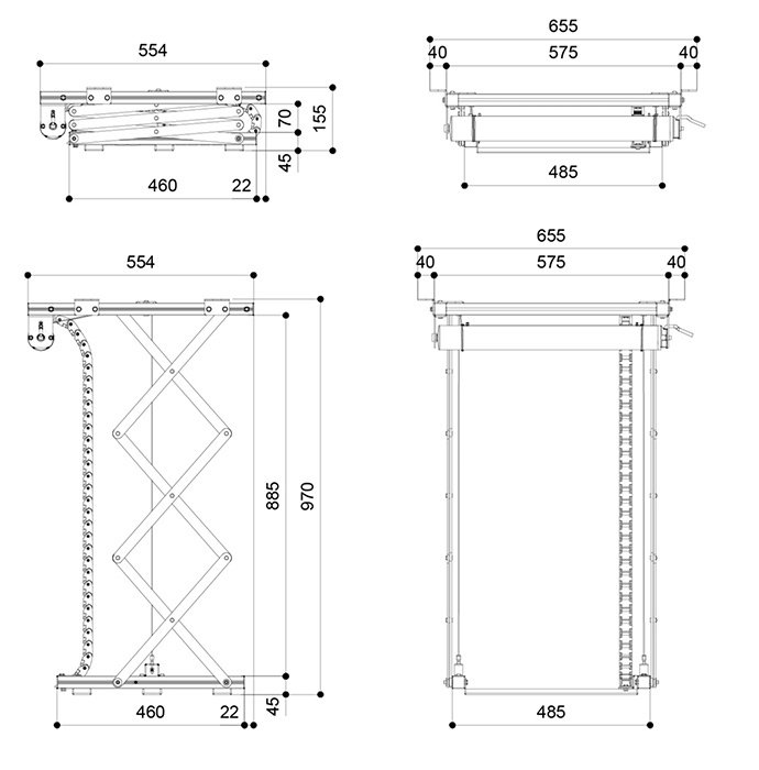 Rozměry uzavřeného výtahu 575 x 155 x 554 mm (š x v x h)