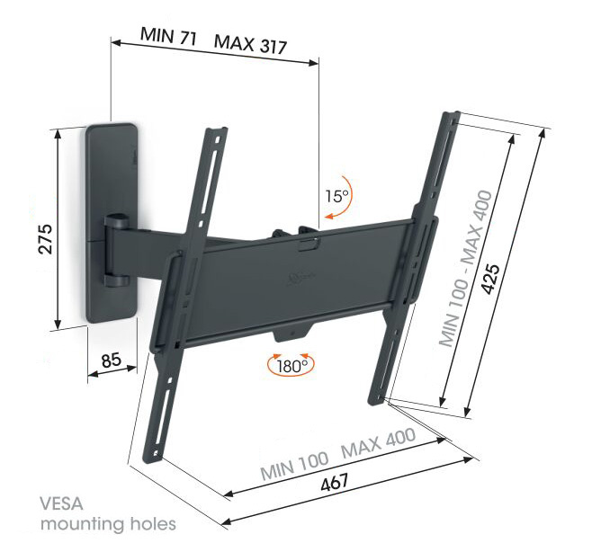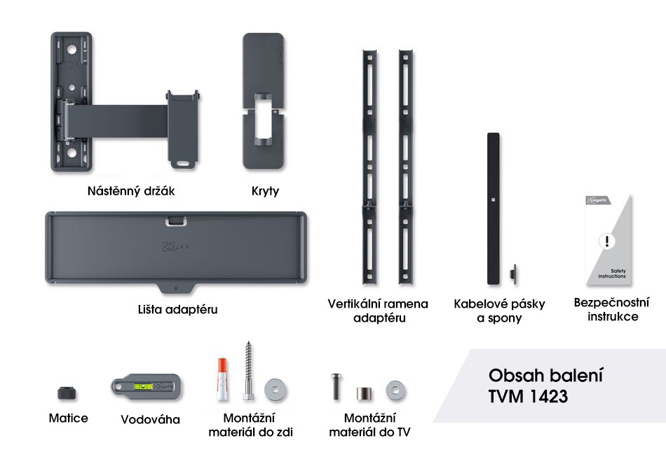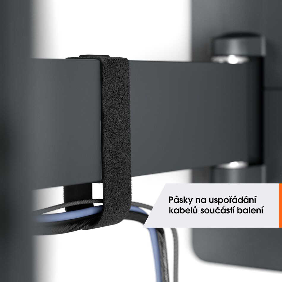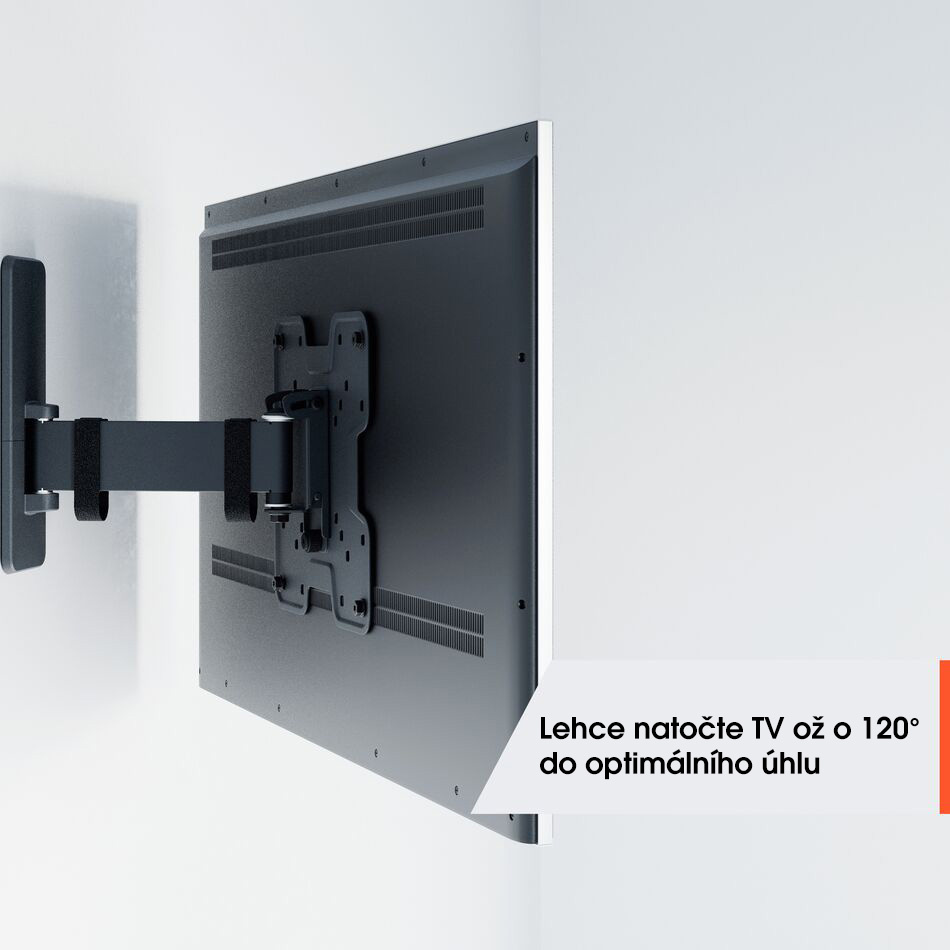 Nástěnné rameno s náklonem pro TV s úhlopříčkou 32-65 palců Rádi byste si svůj televizor užívali naplno, i když nesedíte přímo před ním? Tento nástěnný držák televizoru QUICK Full-Motion vám to umožní. Držák můžete otočit o 120° a naklonit o 15°. A nebojte se, pokud nejste tak šikovní. Instalace držáku je velmi snadná. TV můžete bezpečně připevnit na stěnu za 30 minut. TVM 1423 je vhodný pro televizory s úhlopříčkou 32 až 65 palců a hmotností do 25 kg.