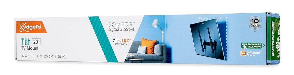 Z televízora, ktorý je štýlovo a bezpečne pripevnený na stene, budete mať väčší pôžitok. A presne to získate s týmto nástenným držiakom série COMFORT Tilt. Bezstarostné sledovanie pre celú rodinu. Vďaka jedinečnému bezpečnostnému systému ClickLoc™ môžete televízor ľahko zamknúť k nástennému držiaku. Počuteľné zaklapnutie vám potvrdí, že je televízor bezpečne zabezpečený na svojom mieste. Na nástennom držiaku sú tiež mäkké podložky. Tie zabraňujú poškriabaniu zadnej strany televízora pri jeho montáži.