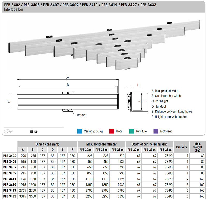 Horizontální část adaptéru systému Connect-it slouží k přímé montáži displeje na zeď, nebo na stropní držáky, stojany a další prvky systému Connect-it. Dodává se v několika délkách, při výběru se řídíme horizontální roztečí montážních otvorů konkrétního displeje (VESA) a jeho šířkou tak, aby adaptér nepřečníval. Ideální pro montáž více displejů vedle sebe a videostěn. Jednotlivé díly lze spolu spojovat do libovolně dlouhých pásů. K vytvoření kompletního adaptéru je třeba vodorovný pás doplnit o vertikální ramena PFS 3xxx.