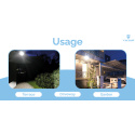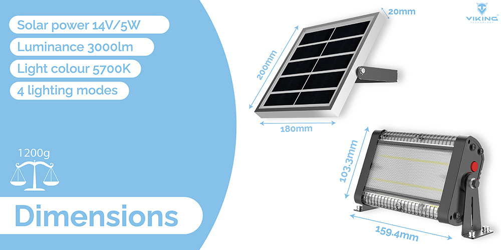 Svítivost 3000 lm • solární napájení • barva světla 5700K (studená bílá) • 4 režimy osvětlení • doba osvětlení za nevhodných podmínek více než 3 dny • odolnost IP65 • kapacita baterie 3,7V/28,86Wh • výkon solárního panelu 14V/5W