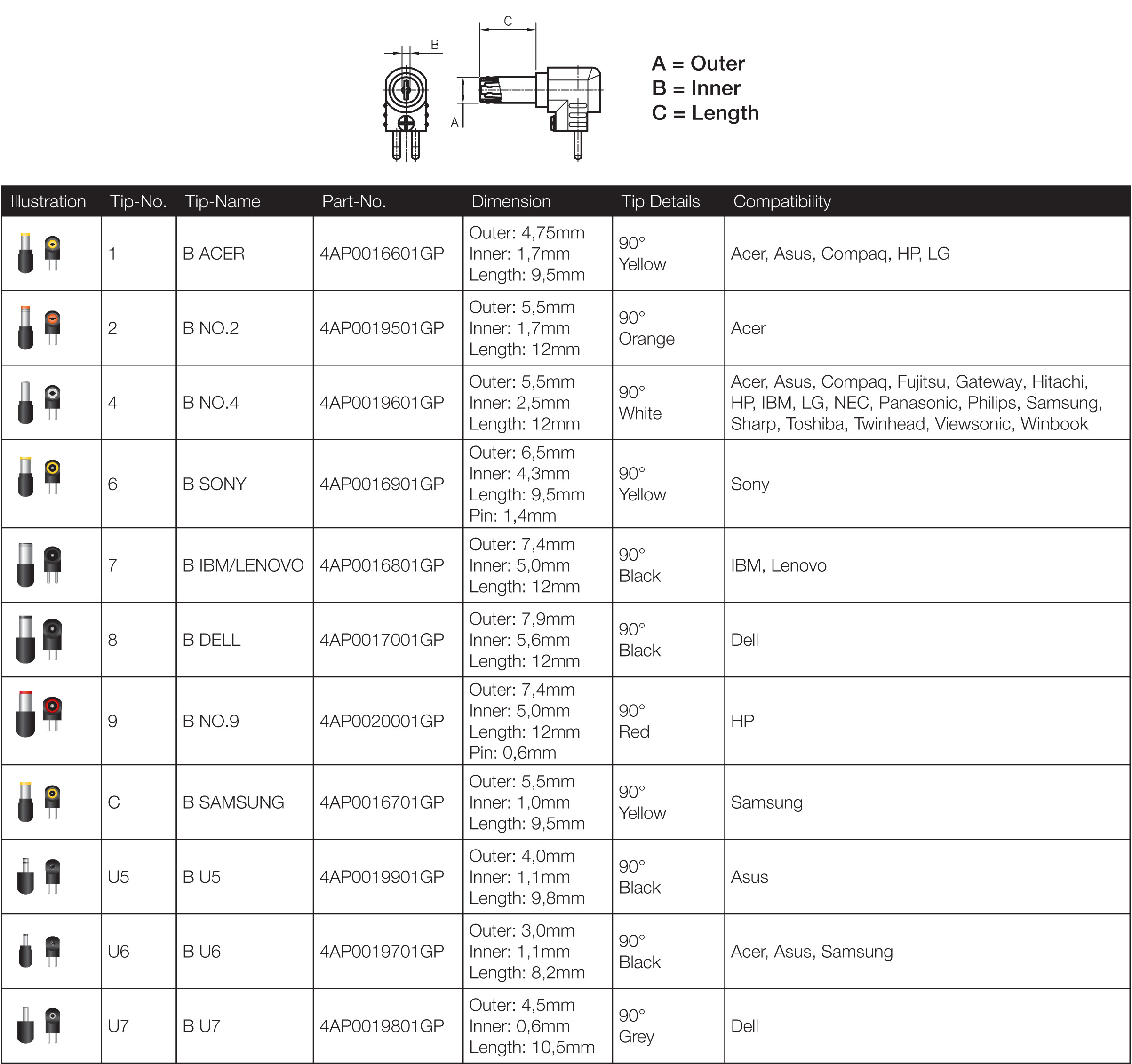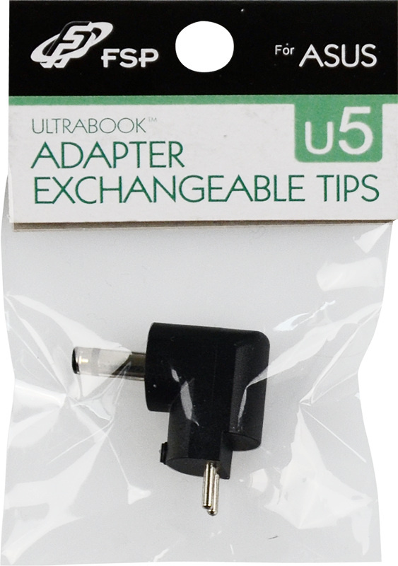 FSP se zajímá a produkuje ekologicky šetrné výrobky. V tomto případě tak nabízí jednotlivé koncovky pro své ekologicky šetrné napájecí adaptéry FSP/Fortron. Je to ta nejlepší volba, pokud potřebujete pouze jednu nebo několik konkrétních koncovek. * vyměnitelná koncovka pro adaptéry FSP/Fortron * koncovka pro ultrabook (Asus) * číslo koncovky: U5 * barva: černá * rozměr vnější: 4 * rozměr vnitřní: 1,1 * délka: 9,8 * retailové balení v sáčku