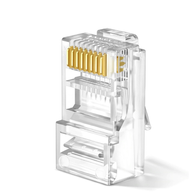 Konektor UTP RJ45, krimpovací, na drát i lanko, nestíněný, 8 pozic 8 kontaktů. Výhodné balení 1000ks. PARAMETRY: RJ45 konektor, 8P8C Barva: průhledná Kategorie: Cat5, Cat5e Druh: nestíněný Typ kabelu: AWG24, drát, lanko (licna) Rozměry(ŠxVxH) 12 x 8 x 23mm