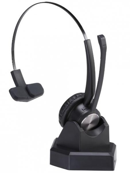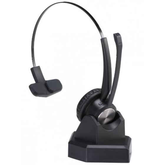 Bezdrátová jednoušní náhlavní souprava s moderním designem a praktickou dokovací stanicí.