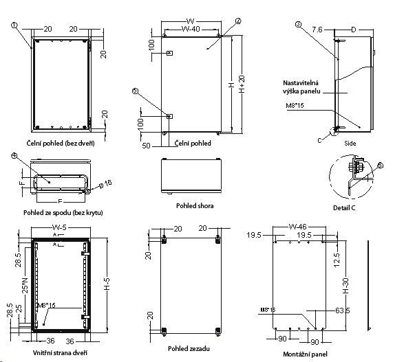 Univerzálny rozvádzač, IP66, oceľový, sivý. Trojvrstvová povrchová úprava (fosfátovanie, máčanie v základnom laku, práškový lak), vymeniteľné dvere, pevná konštrukcia. Odnímateľný kryt káblového prechodu. Rozvádzač je vyrobený z válcovanej ocele o hrúbke 1,5 mm. Štandardy: IEC60529, EN60529/10.91, GB4208-93 Vyhotovenie: dvere - plné, otvárateľné o 110 stupňov, montáž pravá alebo ľavá (užívateľsky vymeniteľné otváranie) zadný kryt - plný bočný kryt - plný horný kryt - plný montážna doska: