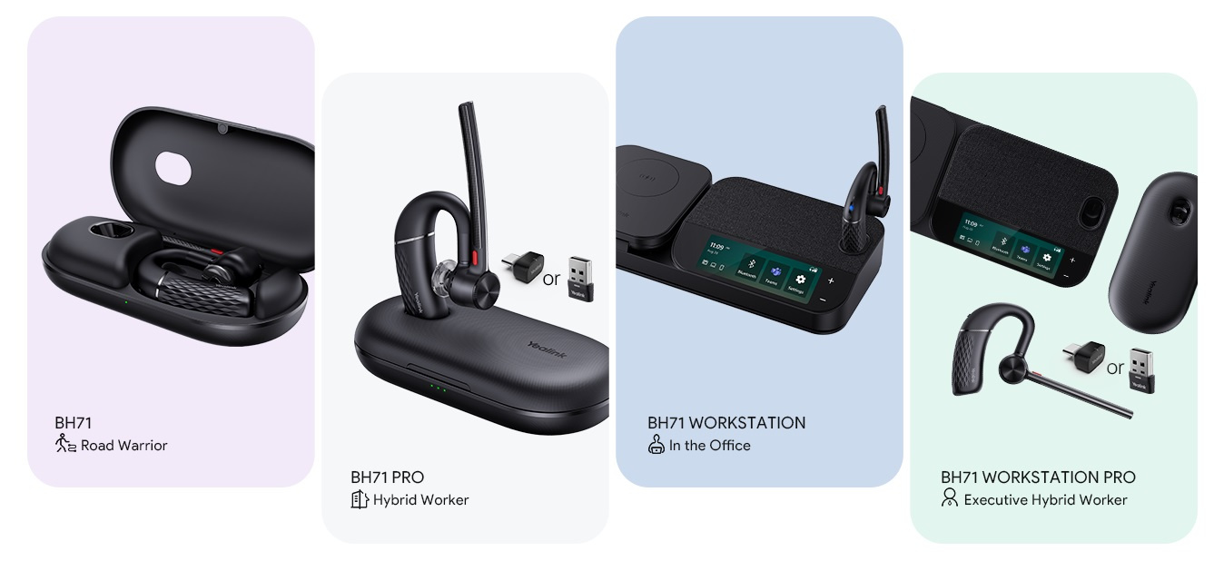 Bezdrátový systém Bluetooth Business Headset BH71 Mono poskytuje kvalitu zvuku s vysokým rozlišením bez ohledu na to, zda jste v autě, ve vlaku nebo v kanceláři, zda se připojíte k vašemu smartphonu, stolnímu telefonu nebo PC. Díky technologii potlačení šumu pomocí 4mikrofonního paprsku budete vždy jasně slyšet. BH71 také poskytuje nastavitelný háček na ucho pro pohodlné nošení a háček můžete snadno vytáhnout, aby co nejlépe seděl vašemu uchu. Ať už jste na cestách nebo v kanceláři, BH71 může zaručit 10 hodin hovoru, aby bylo zajištěno vaše celodenní používání. A co víc, s přenosným nabíjecím pouzdrem BH71 Pro a BH71 Workstation Pro může poskytnout 20 hodin delší výdrže baterie a dokonce pokrýt celý týden používání. Modely BH71 Workstation a BH71 Workstation Pro mají stanici, která se může připojit k vašemu stolnímu telefonu, PC a smartphonu současně a poskytnout vám plnohodnotnou komunikaci UC. Stanice má také 3palcový dotykový displej, hlasitý odposlech, 3 porty USB 3.0 a bezdrátovou nabíječku Qi pro váš smartphone, díky níž bude vaše kancelář vypadat stylově a hezky.