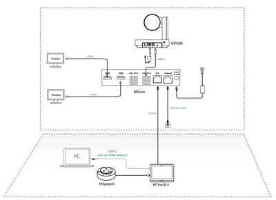 S portem VCH je MCore speciálně navržen pro videokonferenční místnosti, jejichž nasazení lze snadno rozšířit. Jeho all-in-one design s managementem kabelů zároveň zajišťuje stabilitu drátového spojení a lze dosáhnout nejvhodnějšího nasazení podle dispozice zasedací místnosti. Jediný kabel CAT5e zcela stačí k propojení TV části s částí konferenčního stolu, k dokončení přenosu dat a napájení, není potřeba žádný další napájecí zdroj ani prodlužovací kabel, což nejen zjednodušuje nasazení, ale také efektivně snižuje náklady na nasazení.