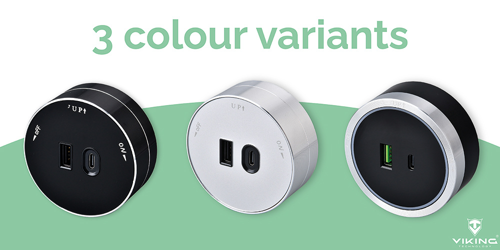 Zásuvkový modul Viking A60 je vybaven jedním USB-A výstupem (5V/2,4A) a jedním USB-C výstupem (5V/3,6A, PD) a je k dispozici ve třech barevných variantách.