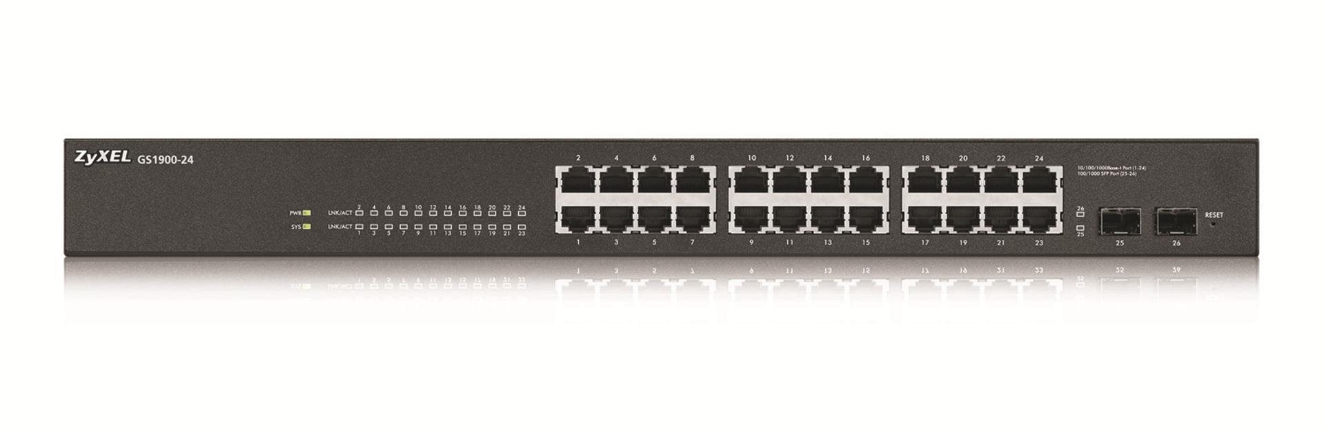 Popis ZYXEL 24xGb 2xSFP fanless rack web sw.GS1900-24 v2