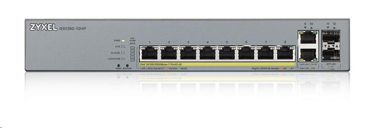 Popis Zyxel GS1350-12HP 12portový inteligentný spravovaný CCTV PoE switch, dlhý dosah, 130W, 10x GbE, 2x SFP