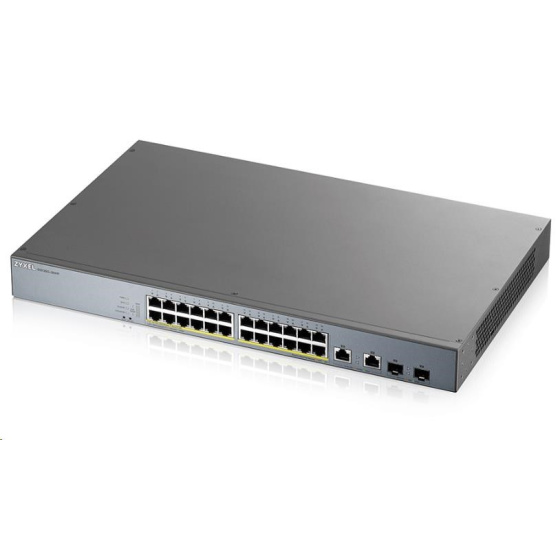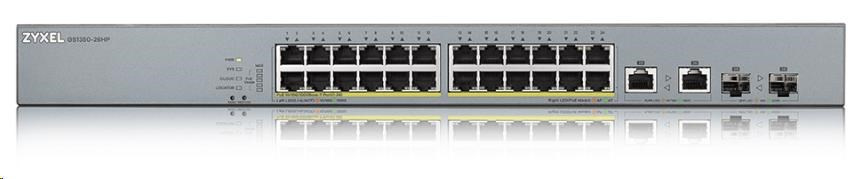 Popis Zyxel GS1350-26HP 26portový inteligentný spravovaný CCTV PoE switch, dlhý dosah, 375W, 24x GbE, 2x combo RJ45/SFP